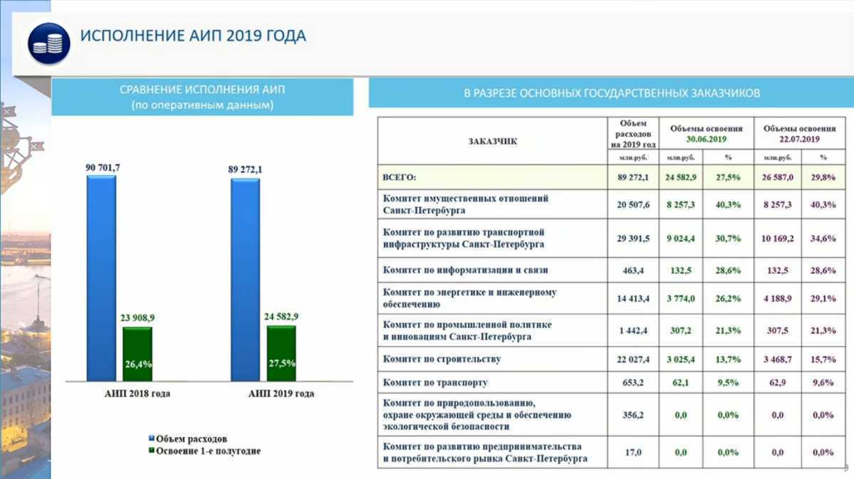 За первое полугодие 2019-ого в тройку лучших по освоению бюджета вошли КИО, КРТИ и комитет по энергетике. Комитет по строительству традиционно оказался среди отстающих – хуже только комитеты по транспорту, предпринимательству и природопользованию.