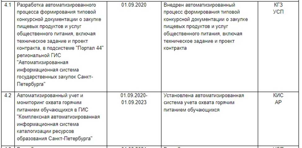 Интересно, что в документе также имеется план по внедрению существующих государственных информационных систем в сектор соцпита. Так, для учета и мониторинга охвата горячим питанием школьников предлагалось использовать ГИС Комобразования , а для контроля закупок ГИС Комитета по госзаказу. ГИС СОЦПИТ, разрабатываемая по распоряжению Беглова, по сути дублирует функции уже существующих информационных систем.