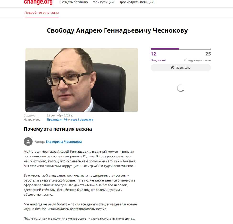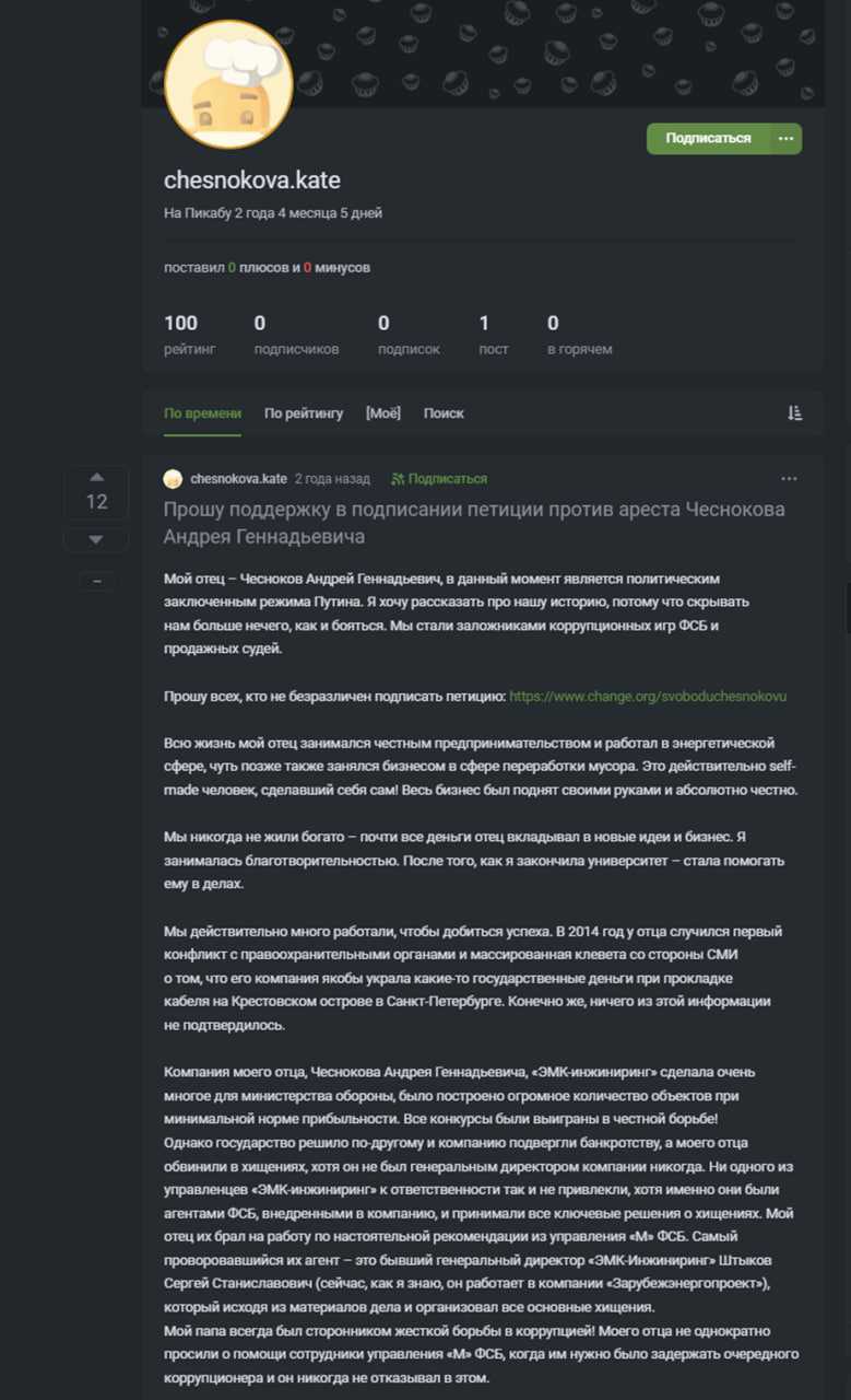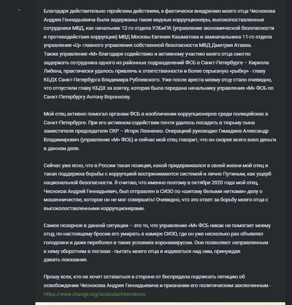 Такой поворот судьбы скорее всего оказался неожиданным не только для Чеснокова, но и для сторонних наблюдателей. Ведь кроме знакомства, так скажем, с не обделенных влиянием предпринимателями ему приписывают связи с могущественным Управлением «М» ФСБ (курирует работу всех остальных правоохранительных органов и судебную систему страны). А пострадал он, якобы, из-за борьбы «эмки» с Управлением «К» ФСБ (экономическая безопасность). Такую версию, в частности, можно найти в душераздирающем призыве о помощи, выложенном на неожиданной площадке – «Пикабу». Автор текста, представившийся дочерью Чеснокова, приписывает ему тесное сотрудничество с контрразведкой в части поимки разных нечестных бизнесменов и чиновников. Якобы Чесноков ловил коррупционеров «на живца», рисковал собой, а с ним так поступили – отправили за решетку. В конце поста на развлекательном портале «дочь» чуть ли не политического заключенного просит подписать петицию в защиту «отца» на портале «Change.org». За два с половиной года петиция собрала всего дюжину подписей.