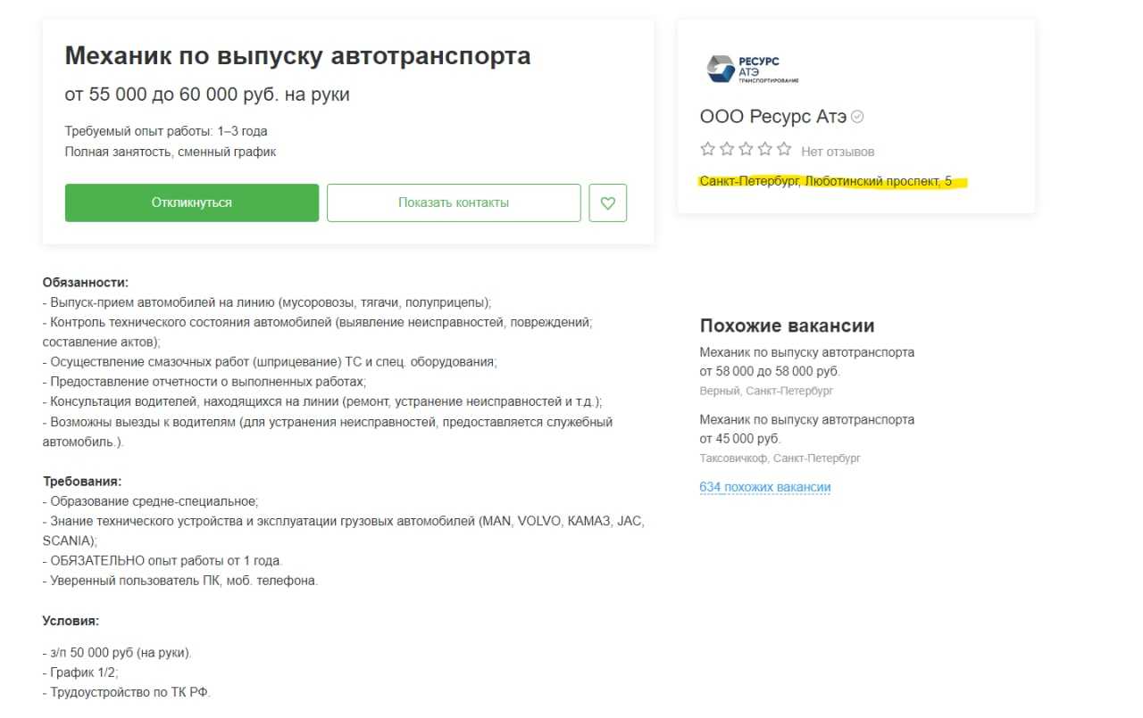Таким образом, победа ООО «Ресурс АТЭ» выглядит как минимум тривиально. Ведь большая часть уставного капитала (51%) компании, созданной 3 декабря 2014 года, принадлежит АО «Первый Спецтранс» , а среди учрежденных «Ресурсом АТЭ» фирм есть ООО «Новый Свет.Эко» . Названия, конечно, отличаются от ключевых позиций контракта, однако еще до конца марта 2022 года основным учредителем в «Ресурс АТЭ» был Константин Язев – ключевая фигура в «Автопарке №1 Спецтранс». После нашего материала про транспортировку отходов в двух районах Ленобласти его фамилию заменило акционерное общество со скрытыми учредителями. Да и с поста гендиректора в «Новом Свете.Эко» (с точкой) он тоже ушел. Однако полностью связи порвать не удалось, ведь если обратиться к агрегатору вакансий hh.ru, то там можно найти несколько актуальных вакансий, где адресом работы фирмы «Ресурс АТЭ» назван Люботинский проспект, 5, то есть соседний дом с официальным адресом АО «Автопарк №1 Спецтранс».