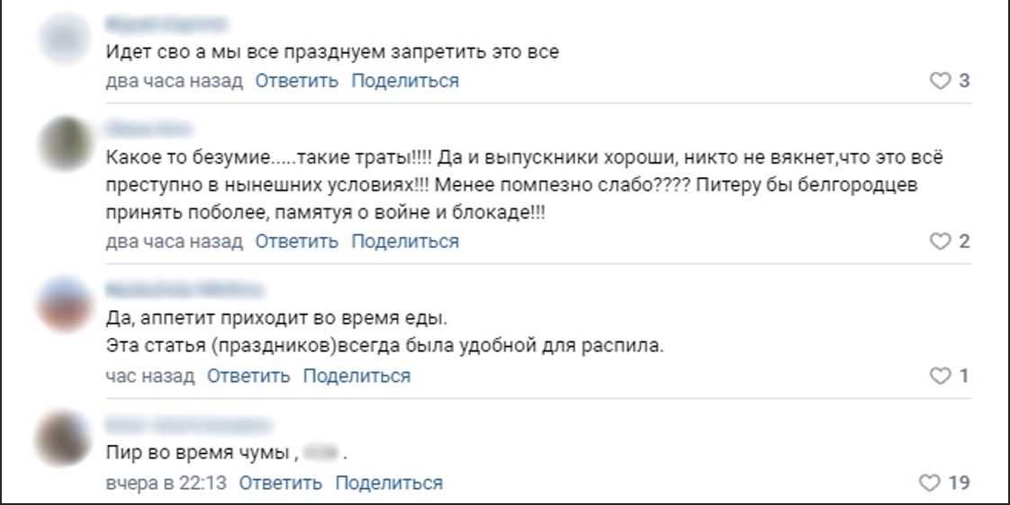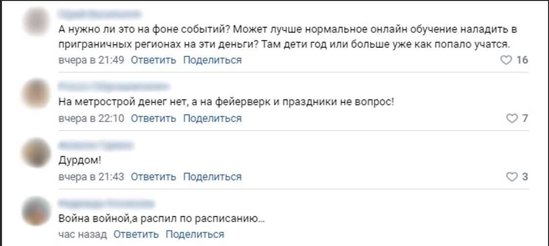 По мнению пользователей Сети, подобные мероприятия необходимо запретить во время проведения специальной военной операции. Некоторые комментаторы называют такие траты «каким-то безумием» в нынешних условиях и «пиром во время чумы». При этом отдельные петербуржцы считают, что данная статья расходов городского бюджета всегда была «удобной для распила».