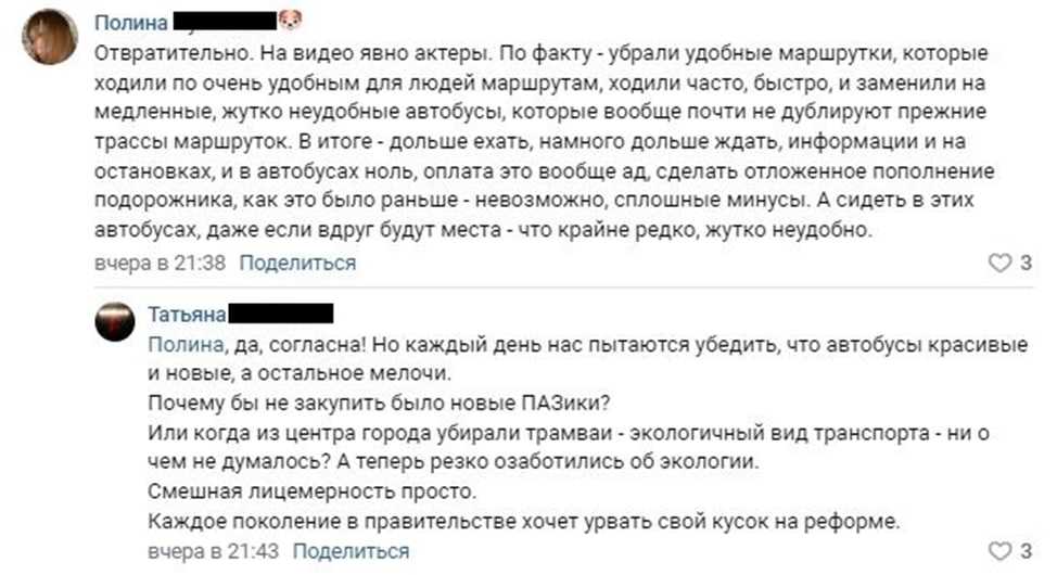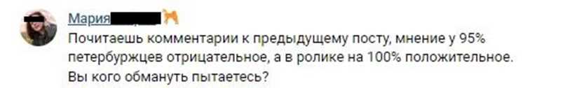 Несмотря на это, ролик «Мнения петербуржцев о транспортной реформе», опубликованный на странице комтранса в соцсети «ВКонтакте», содержит лишь отзывы о новых городских автобусах. Опрошенные рады, что деньги из казны пошли на приобретение техники.