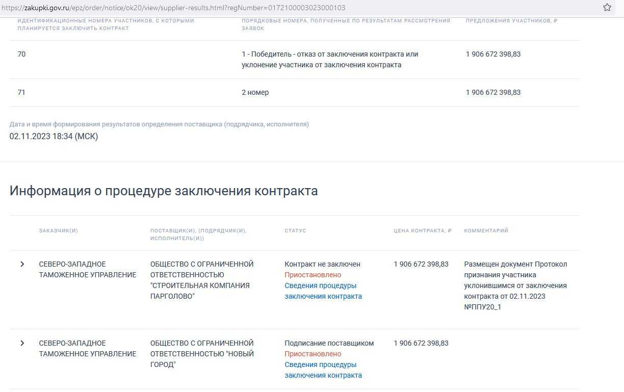 Решение признать ООО «Строительная компания Парголово» (СКП) уклонившимся от подписания договора с СЗТУ принято комиссией заказчика 2 ноября. Правда в самом протоколе, опубликованном в ЕИС, указана дата 2 октября, что явно является опечаткой – как мы уже писали, выбор победителя состоялся 23 октября. Уклонение от подписания мало что значит для обывателя, но работающие с госзаказом понимают - за этим обычно следует занесение компании в Реестр недобросовестных поставщиков (РНП), что на длительное время не дает ей возможности участвовать в торгах.